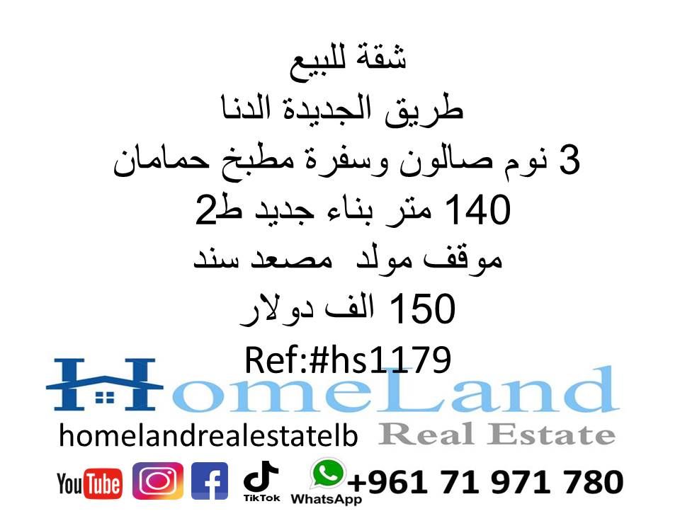 شقة للبيع طريق الجديدة الدنا 3 نوم صالون وسفرة مطبخ وحمامان 140 متر بناء جديد ط 2 موقف مولد مصعد سند 150 ألف دولار مكتب عقاري للتواصل تلفون