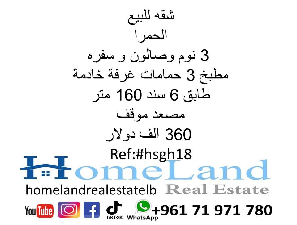 شقة للبيع الحمرا 3 نوم صالون وسفرة مطبخ و3 حمامات 150 متر ط 6 موقف مصعد مولد سند 360 ألف دولار مكتب عقاري للتواصل تلفون