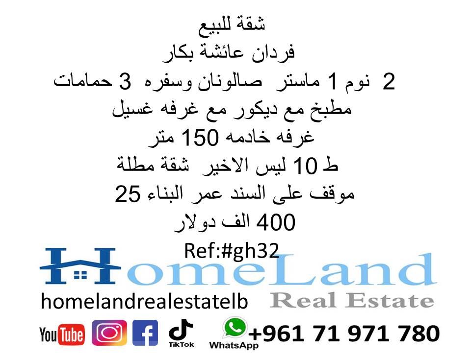 شقة للبيع فردان عائشه بكار 2 نوم 1 ماستر صالونان 1 سفره 3 حمامات مطبخ مع ديكور مع غرفة غسيل غرفة خادمة 150 متر ط 10 ليس الأخير شقة مطلة موقف سيارة على السند عمر البناء 25 400 ألف دولار مكتب عقاري للتواصل تلفون