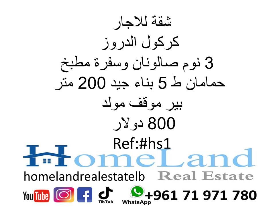 شقة للإيجار كركول الدروز 3 نوم صالونان وسفرة مطبخ حمامان ط 5 بناء جيد 200 متر بئر موقف مولد 800 دولار مكتب عقاري للتواصل تلفون