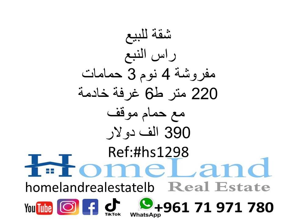 شقة للبيع راس النبع مفروشة 4 نوم 3 حمامات 220 متر ط 6 غرفة خادمة مع حمام موقف 390 ألف دولار مكتب عقاري للتواصل تلفون