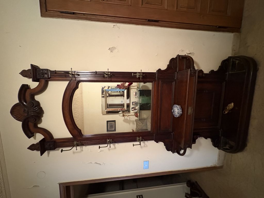 خزانة خشبية قديمة مع مرآة مدمجة، نموذجية للمداخل. تم تصميمه لتخزين الملابس والقبعات والمظلات. هذا النوع من الأثاث عادة ما يكون له 1000 دولار