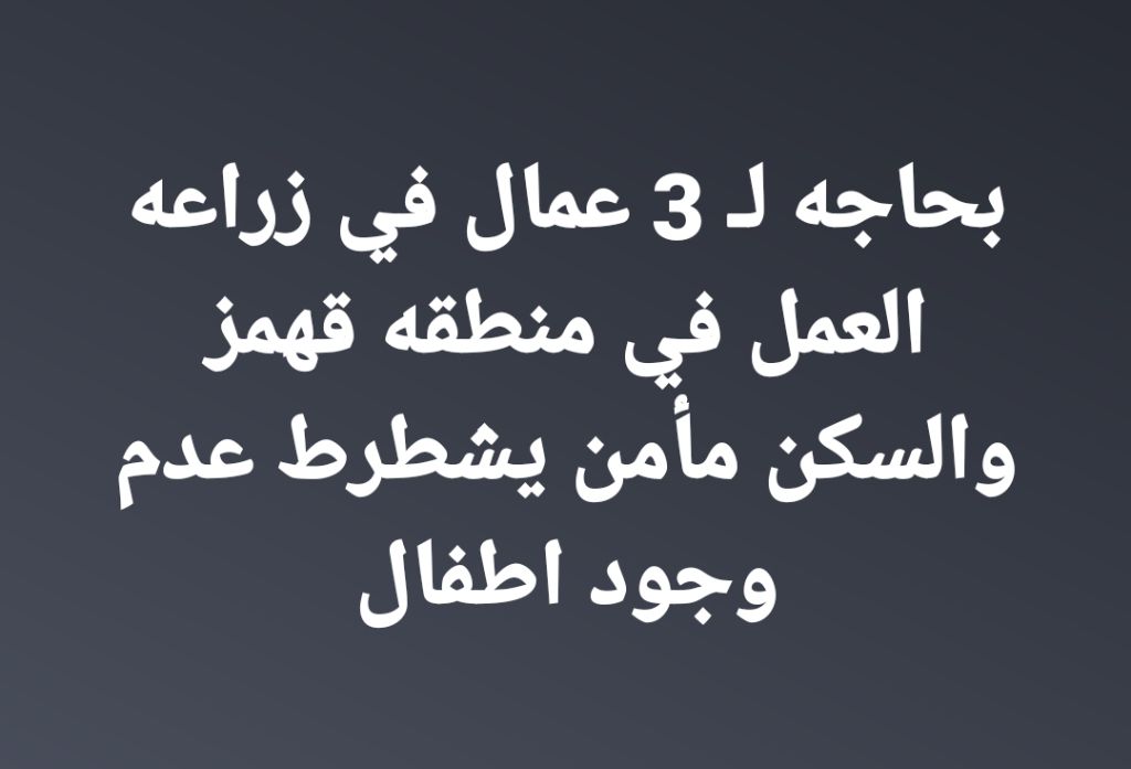 بحاجة ل 3 عمال في زراعة العمل في منطقة قهمز والسكن مأمن يشترط عدم وجود اطفال