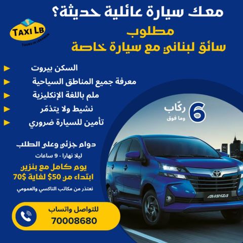 مطلوب سائقين لبنانية فقط مع سيارة عائلية كبيرة 6 ركاب وما فوق حديثة - اقتصادية - العمل والراتب يومي جزئي - نعتذر من أصحاب التاكسي ومكاتب التاكسي - التأمين الزامي والتزام بالمواعيد - هذا العمل لا يناسب المدراء وأصحاب المصالح للتواصل - الحازمية - بيروت