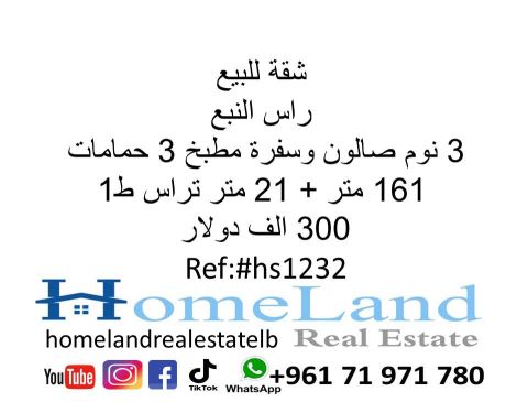 شقة للبيع راس النبع 3 نوم صالون وسفرة مطبخ 3 حمامات 161 متر + 21 متر تراس ط 1 300 ألف دولار مكتب عقاري للتواصل تلفون