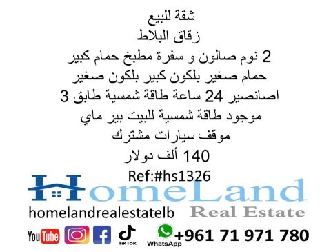 شقة للبيع زقاق البلاط 2 نوم صالون وسفرة مطبخ حمام كبير حمام صغير بلكون كبير بلكون صغير طابق 3 مصعد 24 ساعة طاقة شمسية موجود طاقة شمسية للبيت بئر ماي موقف سيارات مشترك 140 ألف دولار مكتب عقاري للتواصل تلفون