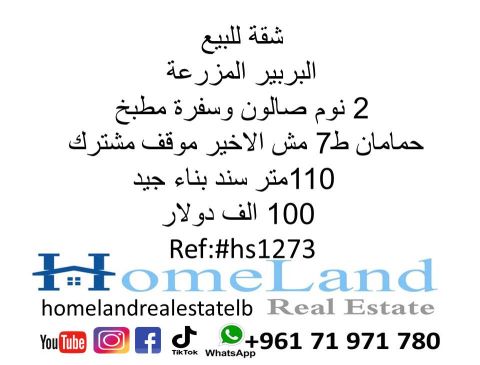 شقة للبيع البربير المزرعة 2 نوم صالون وسفرة مطبخ وحمامان ط 7 أخير موقف مشترك 110 متر سند بناء جيد 100 ألف دولار مكتب عقاري للتواصل تلفون