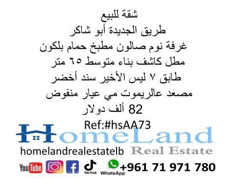 شقة للبيع طريق الجديدة أبو شاكر غرفة نوم، صالون، مطبخ، حمام، بلكون مطل كاشف، بناء متوسط 65 متر، طابق 7 ليس الأخير سند أخضر جاهز، مصعد عالريموت مي عيار، منفوض 82 ألف دولار مكتب عقاري للتواصل تلفون