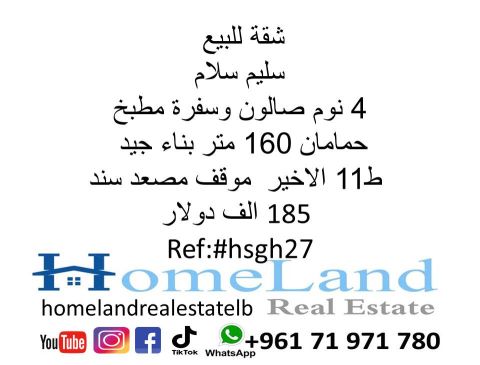 شقة للبيع سليم سلام 4 نوم صالون وسفرة مطبخ وحمامان 160 متر بناء جيد ط 11 الأخير موقف مصعد سند 185 ألف دولار مكتب عقاري للتواصل تلفون