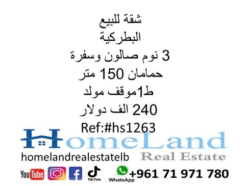 شقة للبيع البطركية 3 نوم صالون وسفرة 2 حمامان 150 متر ط 1 موقف مولد 240 ألف دولار مكتب عقاري للتواصل تلفون