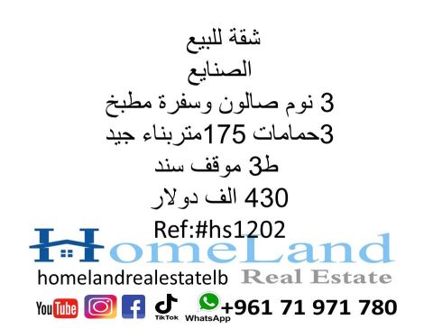 شقة للبيع الصنايع 3 نوم صالون وسفرة مطبخ و3 حمامات 175 متر بناء جيد ط 3 موقف سند 430 ألف دولار مكتب عقاري للتواصل تلفون