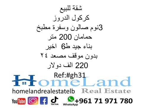شقة للبيع كركول الدروز 3 نوم صالون وسفرة مطبخ وحمامان 200 متر بناء جيد ط 6 أخير بدون موقف مصعد ألف دولار مكتب عقاري للتواصل تلفون
