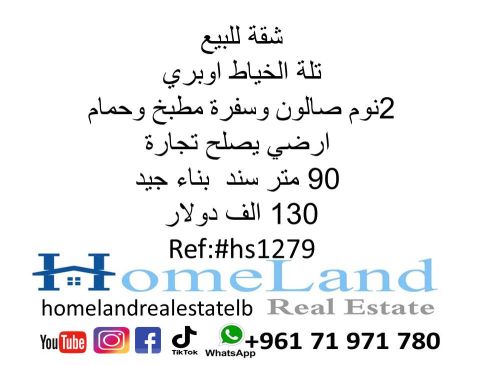 شقة للبيع تلة الخياط أوب ري 2 نوم صالون وسفرة مطبخ وحمام أرضي يصلح تجارة 90 متر سند بناء جيد 130 ألف دولار مكتب عقاري للتواصل تلفون