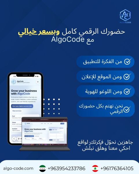 AlgoCode تطوير مواقع الويب تصميم وبرمجة مواقع احترافية (Static & Dynamic) باستخدام أحدث التقنيات. تطوير تطبيقات الموبايل تطبيقات Android وiOS عالية الأداء تلبي احتياجات المستخدمين. أنظمة وبرمجيات مخصصة حلول برمجية مصممة خصيصا لإدارة الأعمال، المتاجر، الأنظمة الادارية، ولوحات التحكم. تواصل معنا WhatsApp / Phone البريد الألكتروني