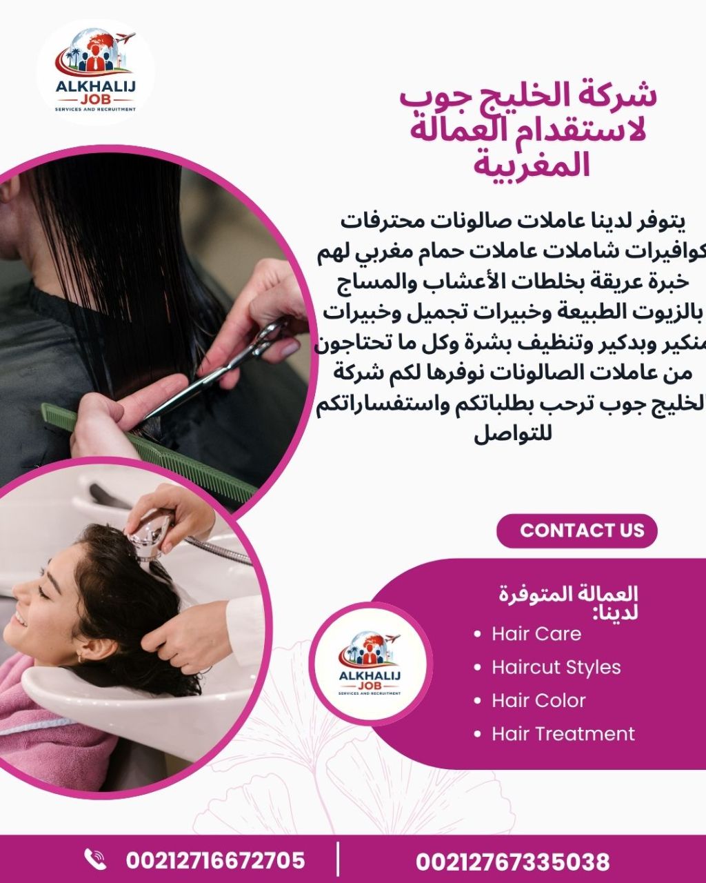 يتوفر لدينا عاملات صالونات محترفات كوافيرات شاملات عاملات حمام مغربي لهم خبرة عريقة بخلطات الأعشاب والمساج بالزيوت الطبيعة وخبيرات تجميل وخبيرات منكير وبدكير وتنظيف بشرة وكل ما تحتاجون من عاملات الصالونات نوفرها لكم ترحب بطلباتكم واستفساراتكم للتواصل