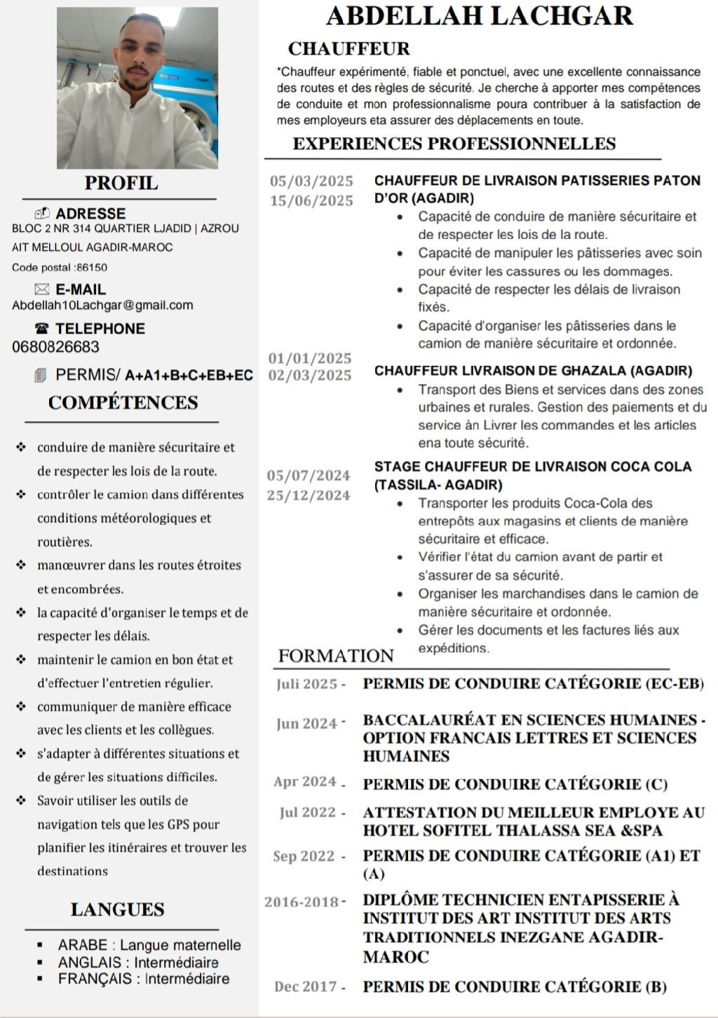 Hello my name is Abdallah from the city of Agadir I work as a professional driver I have all the driving licenses I will be happy for you to contact me