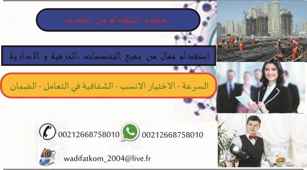 نتوفر على حرفيون - صنايعيه - عمالة عاديون الخ جنسيات مغربية والاستقدام في أسرع وقت. لدينا عمالة مميزة من جميع التخصصات ادكور واناث جاهزين للسفر نحن نوفر لكم كل ما تطلبون من الأيادي العاملة المغربية نحن نعتبر الأفضل والأسرع في الاستقدام وتعاملنا مع أكبر الشركات يثبت اننا الأفضل بفضل الله لكل من يرغب في استقدام عمالة من المغرب ما عليه الا التواصل معنا عبر الايميل
