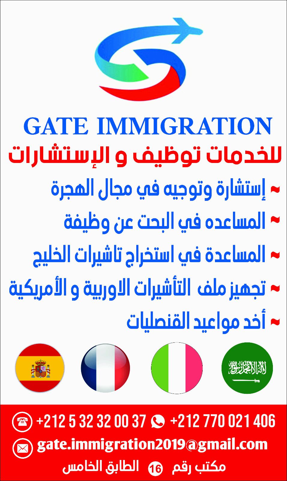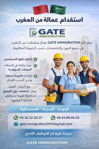 استقدام عمالة من المغرب توفر لكم وكالة GATE IMMIGRATION عمال وعاملات من المغرب في جميع المهن والتخصصات، حسب الشروط المطلوبة. اختيار دقيق للمرشحين خبرة وكفاءة في مختلف المجالات اجراءات قانونية سريعة وموثوقة أقل التكاليف وفي أقرب الآجال نتعامل مع أصحاب العمل في مختلف دول الخليج ونوفر حلول متكاملة لتلبية احتياجاتكم من اليد العاملة المؤهلة. الجودة - السرعة - المصداقية للتواصل معنا GATE IMMIGRATION خبرتنا