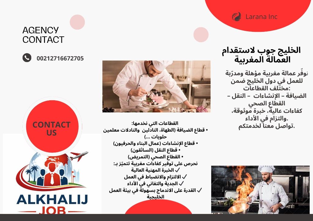 الخليج جوب للتوظيف نوفر من المغرب اصطاف كامل من كوادر المطاعم والفنادق والكوفي شوب للعمل في دول الخليج خبرة في أرقى مطاعم المغرب نتوفر على طباخين تخصص الطبخ الغربي والإيطالي والمغربي - معلمين شاورما - معلمين بيتزا تخصص البيتزا الإيطالية - معلمين حلويات تخصص الحلويات الغربية والفرنسية والمغربية - معلم باريستا تخصص العصير بأنواعها وأشكالها والرسم على القهوة نادلين. نادلات. كابتن صالة. مدير صالة