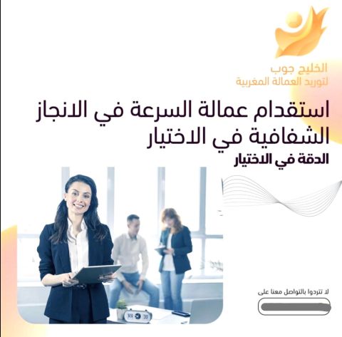 شركة الخليج جوب لاستقدام العمالة المغربية للعمل في دول الخليج نوفر عمالة مغربية مؤهلة ومدربة في جميع المجالات الطهاة، النادلين والنادلات، عمال البناء، الحرفيين، العمالة المنزلية، المزارعين، السائقين، وطاقم التمريض. كفاءات مغربية تضمن الجودة والتفاني لتلبية احتياجاتكم يتميزون الكفاءة العالية والخبرة. الالتزام والعمل الجاد. الثقافة القريبة من المجتمعات الخليجية لا تتردوا بالتواصل معنا لخدمتكم نرحب بكم