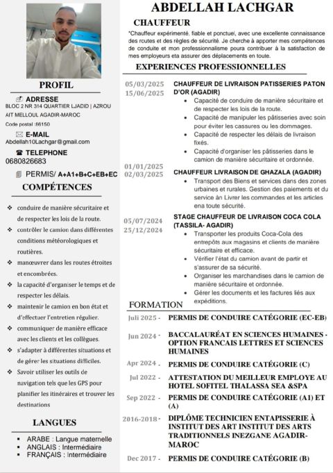 اسمي عبدالله من المغرب اعمل سائق مهني أتوفر على جميع رخص السياقة سأكون سعيدا بتواصلكم معي شكرا
