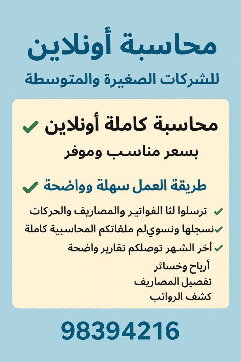 أنا محاسب خبرة بتأسيس النظام المحاسبي واعداد القوائم المالية توفير معلومات دقيقة عن التكاليف والمصروفات والايرادات وصافي الأرباح وتقديم ودراسات الجدوى الحقيقية لاستثمارات بعوائد كبيرة وتكلفة منخفضة وعمل استراتيجية مالية لتطوير المؤسسات وزيادة مصادر الدخل وتخفيض المصروفات والتوسع خارج وداخل الدولة لدى خبرة بالسوق الخليجي والمصري. يشرفني التواصل