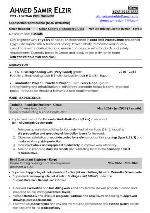 مهندس مدني متواجد في مسقط خبرة 9 سنين. داخل الامارات 3 سنين علي دراية بمراحل تنفيذ المشاريع ابتداء من الخرسانات حتى مرحلة التشطيبات بكفاءة عالية وخلفيه ببرامج التصميم للعمل في مكتب استشاري لدي رخصة قيادة