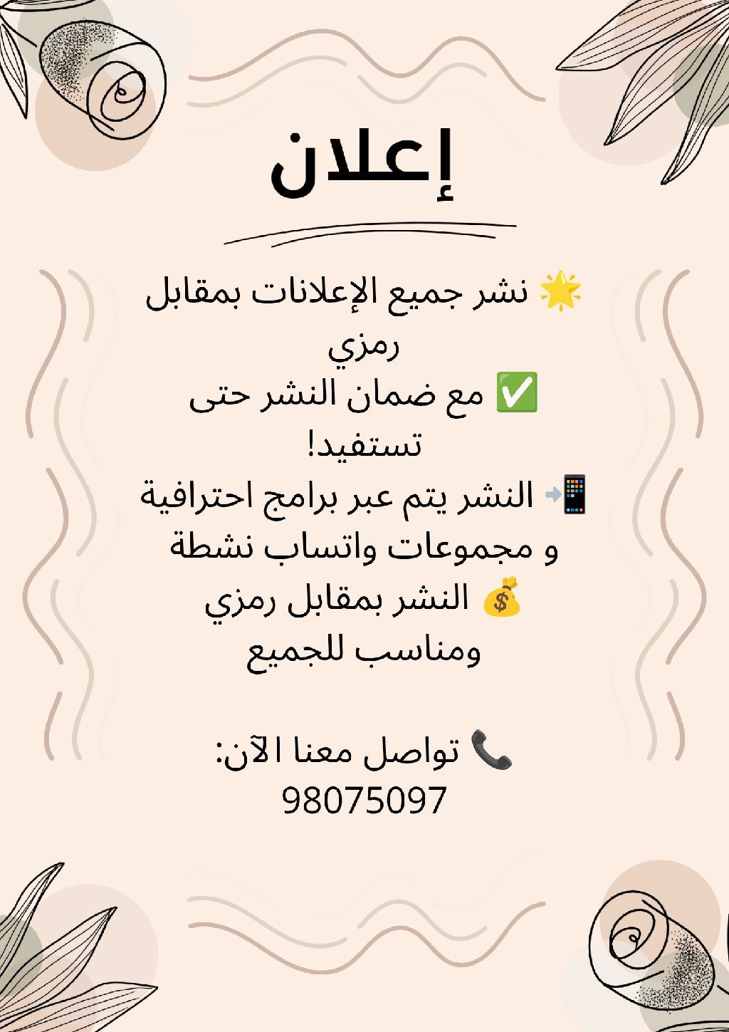 نشر جميع الاعلانات بمقابل رمزي مع ضمان النشر حتى تستفيد النشر يتم عبر برامج احترافية ومجموعات واتساب نشطة النشر بمقابل رمزي ومناسب للجميع تواصل معنا الآن