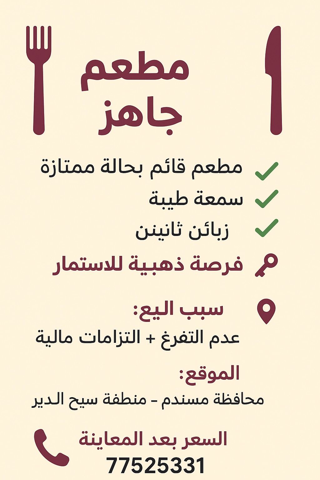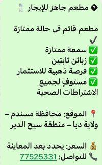 مطعم جاهز للإيجار مطعم قائم في حالة ممتازة سمعة ممتازة زبائن ثابتين فرصة ذهبية للاستثمار مستوف لجميع الاشتراطات الصحية الموقع محافظة مسندم - ولاية دبا - منطقة سيح الدير السعر يحدد بعد المعاينة
