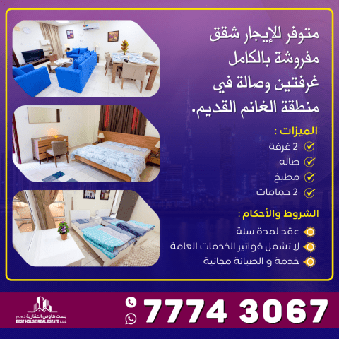 For rent in Old Ghanim (near the Seven Signal) Apartment consisting of (2 bedrooms + living room + 2 bathrooms + kitchen) Including (maintenance + air conditioning) Price. 4600 For inquiries and viewing