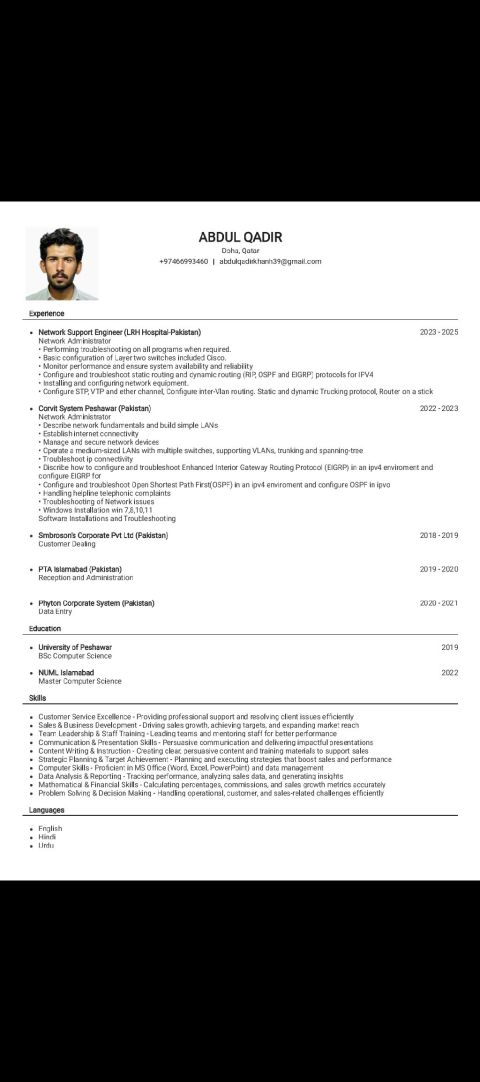 I am Abdul Qadir from Pakistani, live in Doha Qatar, looking for the job of any kind off for now because I am new here so don't have any experience in field in Qatar, Basically I have a master in Computer Science from NUML Islamabad university I have bachelor degree also in Computer Science, for now im available for computer related job or office work
