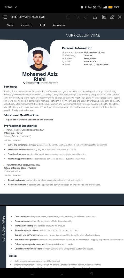 I am currently based in Doha and actively seeking a full time position in Sales, Marketing, Customer Service, or Support. I have over 5 years of experience in client handling, lead generation, and business development, with strong communication and customer relationship skills. Available to join immediately. Contact Email Location Doha, Qatar