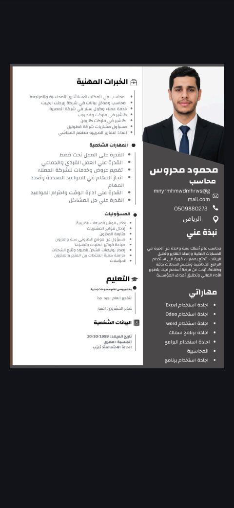 أنا شاب مصري طموح ابحث عن فرصة عمل تناسب خبرتي في المحاسبة المالية وإدارة التكاليف تحليل البيانات لتحسين الربحية ومراقبة التدفقات وإدارة المخزون وتنظيم الجرد وموظف موارد بشرية والخدمات العامة في كل ما يخص مسير الرواتب وانشاء عقود العمل الخ. أتميز بالدقة والالتزام بالمواعيد وقدرة على العمل الجماعي مع حرصي على تطوير مهاراتي باستمرار أطمح بيئة عمل حضارية تسعي للتطوير النمو