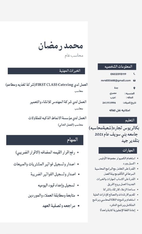 مدير حسابات محترف مع خبرة واسعة في الإدارة المالية والتحليل ابحث عن فرصة عمل كمدير حسابات في شركة متطورة. أنا أحمد الشاعر، مدير حسابات، خبرة تزيد عن 10 سنوات في إدارة الحسابات والتحليل المالي في قطاعات متعددة. الخبرات الرئيسية مدير حسابات في شركات تأجير سيارات، تجارة الجملة، التجزئة، التكنولوجيا، والتسويق. اعداد القوائم المالية والتقارير المالية الشهرية والسنوية. تحليل السيولة، التدفقات النقدية، والربحية