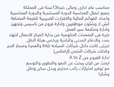 لدي خبرة في العديد من المجالات في مصر فلقد عملت بالمجالات الأتية المحاسبة - الموارد البشرية - المخازن - الادارة اللوجستية (كاشير) دعم عملاء - الاستقبال بالفنادق - التسويق والمبيعات - واعمل محاسب ومشرف كاشير بمطعم في الرياض ببرنامج فودكس ومسوق عقارات ولدي رخصة قيادة سارية والإقامة سارية ومتاح للعمل بأي مكان بالمملكة فورا