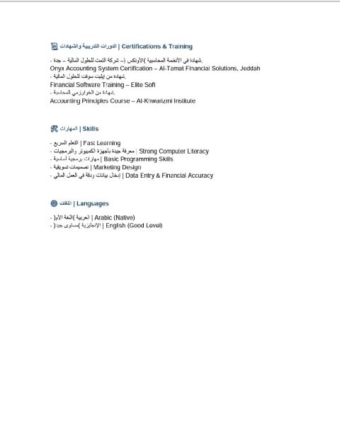 محاسب سوداني خبرة عملية 11 سنة في مجال المحاسبه وإدارة الحسابات الخاصه والمطاعم والمقاولات أسعى دائما الى تقديم حلول مالية مبتكرة تساعد على تحسين كفاءة الأداء وضمان الالتزام بالمعايير المحاسبية والضريبية وأتمتع بدقة عالية في التفاصيل واتقان برامج المحاسبة (دفترة، نظام أسواق، أونكس برو، نظام أسماك 5 + 6، والاكسل، الوورد) والتعامل مع المنصات الحكومية ورفع الرواتب في مدد والبنوك