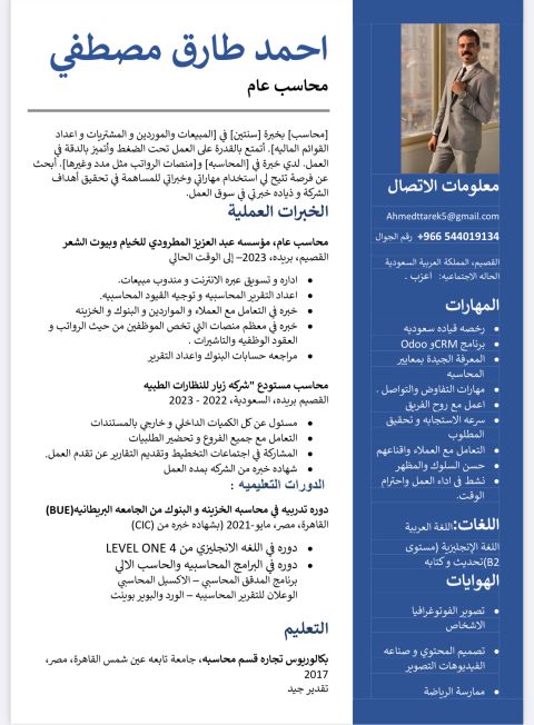 محاسب مصري خبرة 6 سنوات في السعودية خبرة في مجال المواد الغذائية والسوبر ماركت
