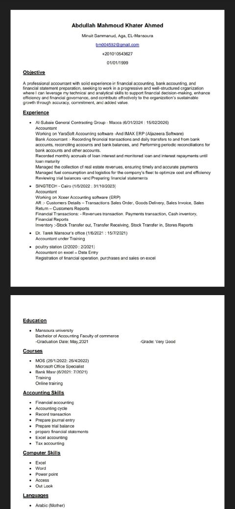 أنا محاسب مصري خريج نظم ومعلومات اداريه عندي خبرة في مجال المقاولات سنتين بمصانع بلوك وخرسانة وأداره المكان وتنظيم محاسب ومدير مشروع مدير تشغيل ومحاسب بخبرة في إدارة عمليات مصانع مواد البناء، وتحسين كفاءة التشغيل من خلال تطوير الاجراءات ومتابعة سير العمل بضمان رفع الانتاجية وجودة الأداء. مهارات استخدام برامج الحاسوب بشكل ممتاز خبرة في استخدام البرامج الحسابيه إدارة عمليات المصنع اليومية بشكل فعال ومرن