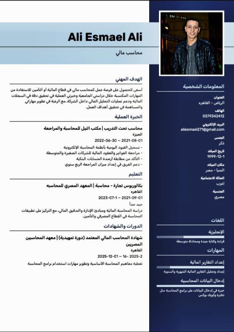محاسب بخبرة عملية في شركات مقاولات وصناعة وتجارة، متخصص في تسجيل القيود اليومية، التسويات البنكية، متابعة العملاء والموردين، اعداد الرواتب والتقارير المالية، واستخدام أنظمة المحاسبة مثل Daftra وOdoo وSmart Life، مع اجادة Excel والعمل بدقة تحت الضغط