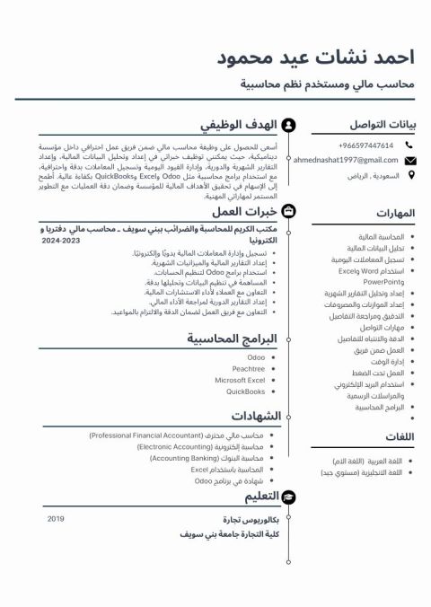 محاسب محترف جاهز للعمل فورا - مقيم في الرياض. بإمكاني التنقل الى أي منطقة. امتلك خبرة عملية تمتد لأكثر من 3 سنوات في مجال المحاسبة المالية، وإدارة المخزون، واعداد التقارير باستخدام نظام Odoo ERP. عملت في قطاعات متنوعة تشمل الشركات الطبية، المؤسسات التعليمية، ومكاتب المحاسبة والضرائب، مما اكسبني قدرة عالية على التعامل مع المعاملات المالية اليومية، إدارة قواعد البيانات، اعداد الموازنات والقوائم الم