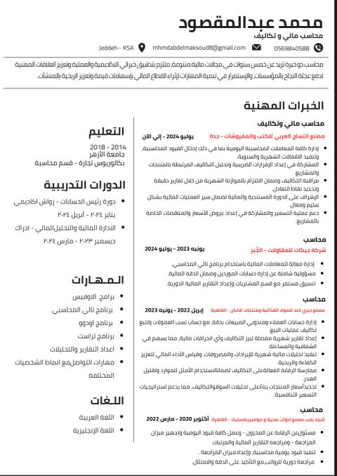 مدير مالي واداري وتنفيذي سوداني خبرة 20 عام في القوائم المالية والتحليل المالي والتخطيط الاستراتيجي والإقفالات الشهرية والسنوية والاقرارات الضريبية والزكوية وإدارة التدفقات النقدية والأصول الثابتة والاعتمادات المستندية علاقة ممتازة بالبنوك وخبرة في سوق الأموال وسوق نمو عملت بالمجال الطبي والمستشفيات والمقاولات والعقارات والتجزئة والتجارة وبمكاتب مراجعة الحسابات لغة انجليزية مستوى متقدم