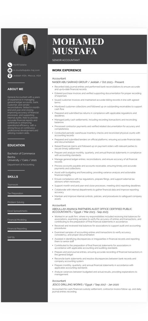 محاسب بخبرة في اعداد التقارير المالية، تحليل الحسابات، والتعامل مع الأنظمة المحاسبية الحديثة. امتلك دقة عالية في العمل وقدرة على تحسين الاجراءات المالية. ابحث عن فرصة عمل أساهم من خلالها في تطوير الأداء المالي وتحقيق أهداف المنشأة