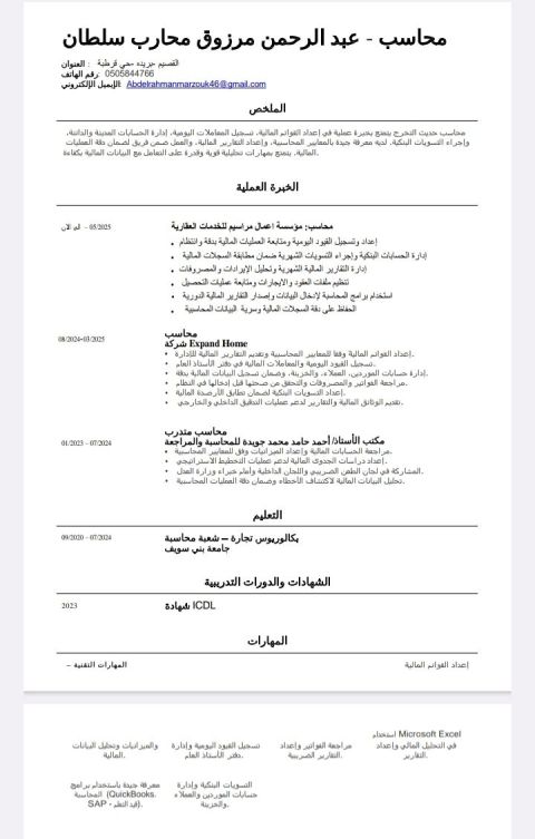 ابحث عن عمل محاسب أو كاشير أو مدهل بيانات، صيدلاني، تفاصيل السيرة ذاتية كاملة في الصورة