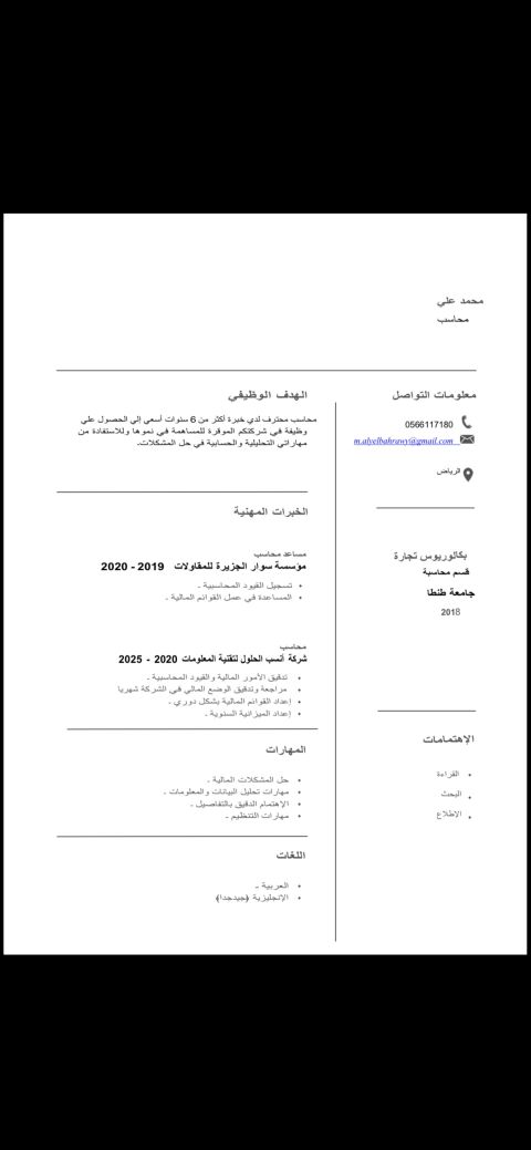 محاسب مالي عملت في عدد من المصانع عملت علي عدد من برامج الحسابات الماليه مقيم في الرياض مستعد للعمل في أي مدينة بالمملكة مهنة في الإقامة محاسب حاصل علي عضوية هيئة المحاسبين السعودية