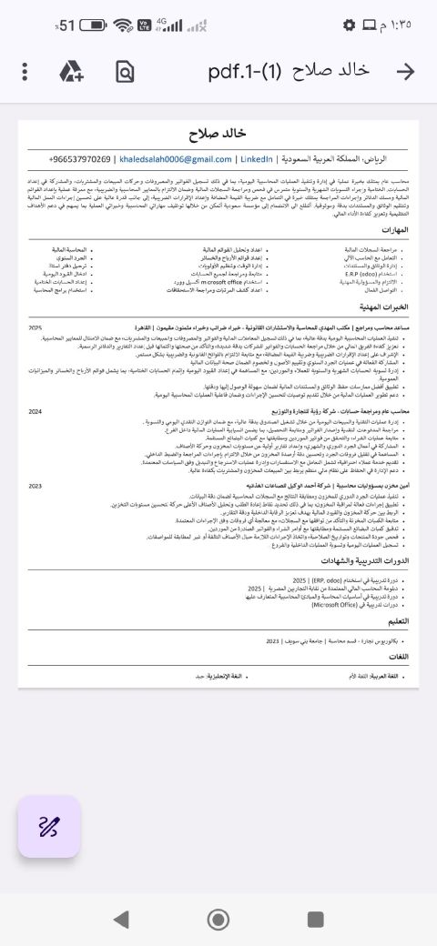 محاسب عام خبرة في اعداد دليل الحسابات ومتابعة العملاء والموردين وعهد الموظفين والسلف ومطابقة الخزينة والبنوك بشكل يومي ومتابعة المخازن والتسوية الجردية والحسابات الختامية والتقارير الضريبة ومطابقتها مع ميزان المراجعة سواء على سيستم أو أكسيل. خبرة في تقديم القوائم المالية من قائمة الدخل والمركز المالي للشركة. خبرة تسعة سنوات داخل المملكة