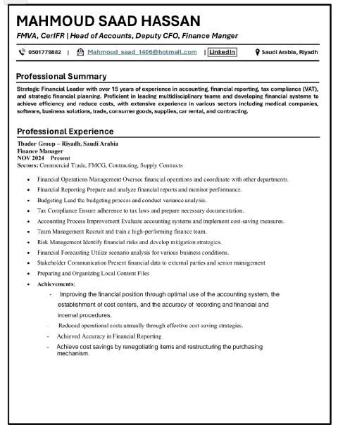 Financial manager and chartered accountant CMA - SOCPA - PFA - IFRS More than 22 years of experience in managing large companies and institutions, accounting, auditing, tax offices, company establishment, bank financing, budgets, and value - added tax returns