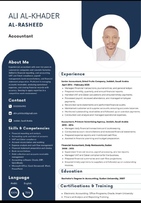 Sudanese accountant with a master's degree in accounting and finance and eight years of practical experience, five of which are within the Saudi labor system in the fields of contracting and companies. Registered with the Saudi Organization for Certified Public Accountants and Auditors. SOCPA membership. Job opportunity. Experience in preparing financial statements, preparing various tax returns