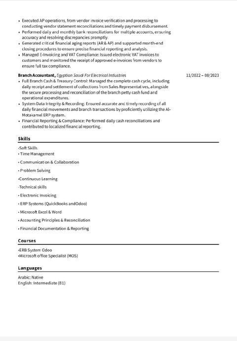 Experienced Egyptian Accountant with three years of verified professional experience in the Egyptian market, complemented by valuable current remote accounting experience with a Qatari company (not yet reflected in my CV) I am actively seeking a full time employment opportunity in a GCC country, whether a desk - based (on - site) or remote (online) position. I possess immediate travel readiness and