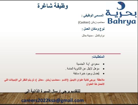 المسمى الوظيفي في حائل حي الوسيطاء طريق الملك فهد محاسب زبائن (Cashier) نوع ومكان العمل دوام كامل - مدينة حائل المتطلبات سعودي / ة الجنسية. مؤهل لا يقل عن الثانوية العامة. يفضل وجود خبرة سابقة. للتقديم يرجى إرسال السيرة الذاتية الى ملاحظة يرجى كتابة عنوان الايميل (الاسم - محاسب زبائن - حائل لن يتم النظر الى الايميلات التي لا تحمل هذا العنوان