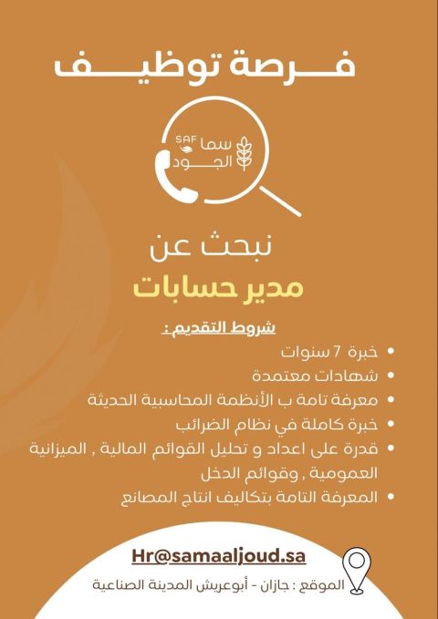 مطلوب مدير حسابات جاهز للعمل فورا في مصنع سما الجود للأعلاف جازان المنطقة الصناعية